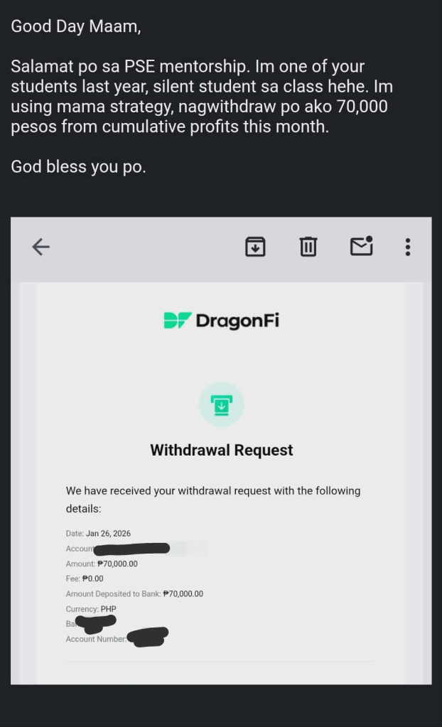One of our students managed to withdraw 70,000 pesos mula sa profits niya sa mga stock trades niya sa PSE.