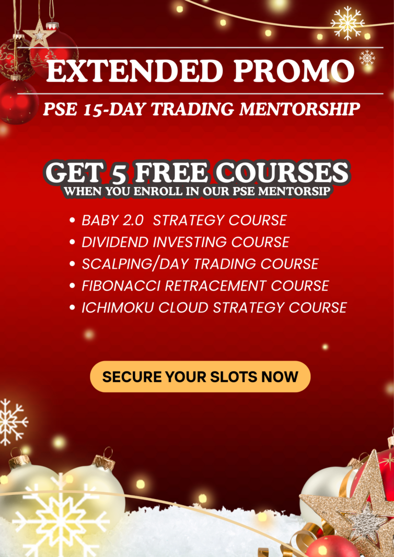 If you are interested to learn how to trade PSE stocks ay may 15-day mentorship kami na inooffer. May free Dividend Investing, Scalping strategy, BABY 2.0 Strategy, Fibonacci at Ichimoku siyang kasama.