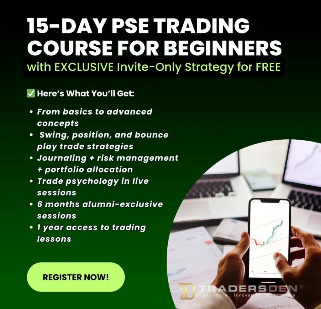 If you are interested to learn how to trade PSE stocks ay may 15-day mentorship kami na inooffer. May free Dividend Investing, Scalping startegy, BABY 2.0 Strategy, Fibonacci at Ichimoku siyang kasama.