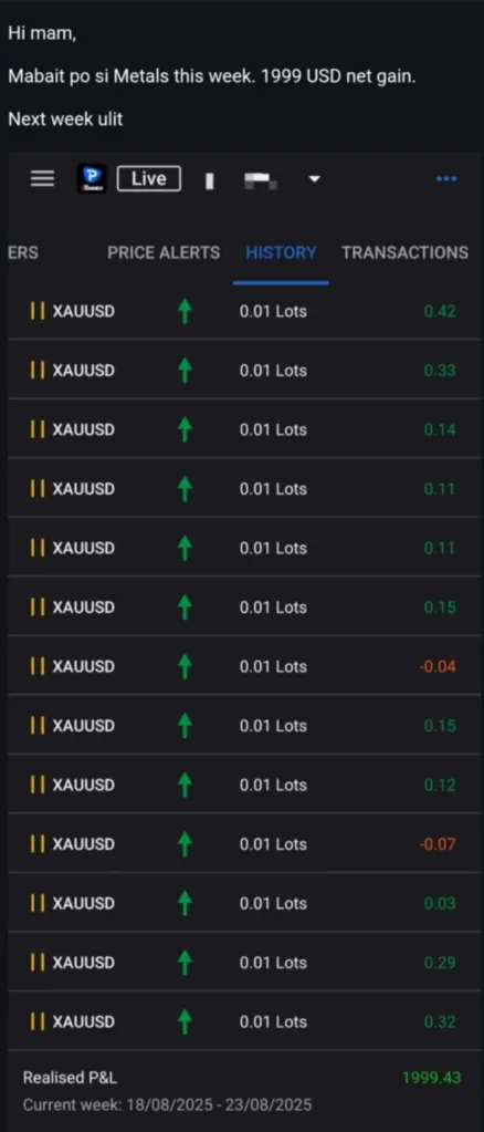Blog Ganito Inabuso At Pinerahan ng Aming Mga Students Ang Scalping This Week! (Real Proof!) August 25, 2025 / Momentum scalping is the best.Mabilisang entry at exit lang.Walang limit ang profits.Walang katapusan ang opportunities.Heto ang ilan sa mga kinita ng aming mga metal scalpers this week! Join us sa last batch ng Metals Masterclass this year! Avail it here:https://form.jotform.com/232946879623472