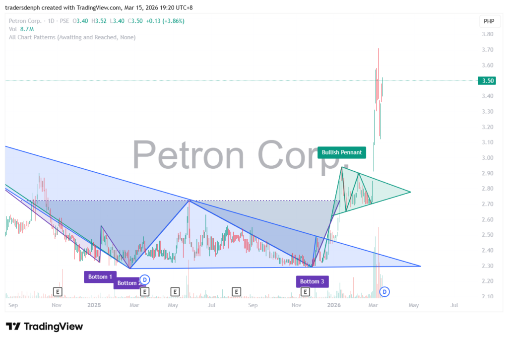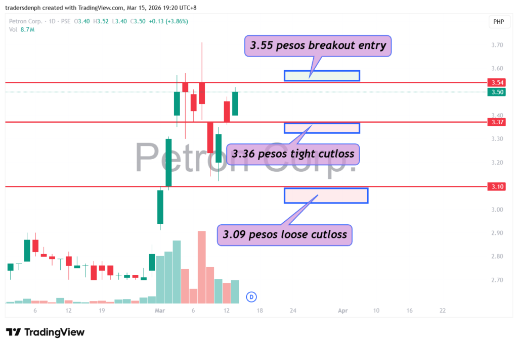 Ang price to break ni PCOR ngayon ay 3.54 pesos kaya ang breakout entry mo ay nasa 3.55 pesos. Ang cutloss point mo na tight ay nasa 3.36 pesos. Ang loose na cutloss point mo ay nasa unang breakout level which was its major support. Nasa 3.09 pesos.