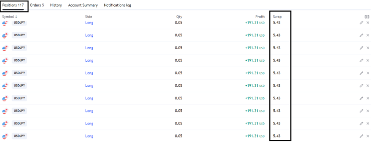 I have 117 positions on USDJPY at bawat positions ko ay kumita ng swaps na worth 5.43 usd.