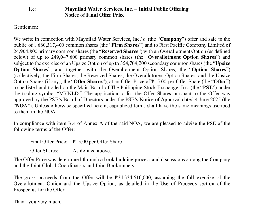Maynilad Water Services Inc. has priced its initial public offering (IPO) at P15 per share, valuing its stock market debut this month at P34.33 billion.