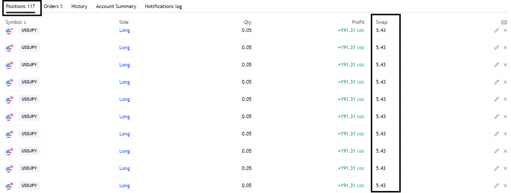 I have 117 positions on USDJPY at bawat positions ko ay kumita ng swaps na worth 5.43 usd.