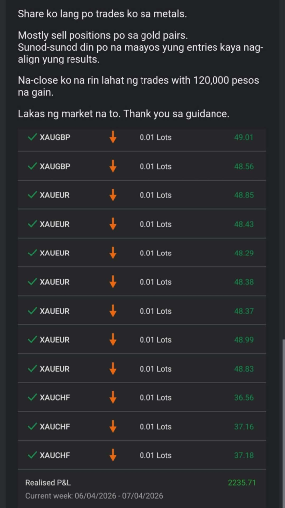 Blog Namumulot Ng 80,000 Pesos Profit Sa Gold! April 8, 2026 / Umuulan ang opportunities sa gold and silver market.I managed to earn over 80,000 pesos kahapon. Our students are earning as well. Kaya mo din ito!Come give our mmentorship a try!Join us here for forex, PSE Masterclass, metals, crypto and US stock market trading mentorship:https://form.jotform.com/232946879623472Join us here for PSE stock trading mentorship:https://form.jotform.com/241343777522458If you want an inexpensive option ay come and try our forex and metals crash course.Enroll here: https://form.jotform.com/260880559219466If you join us TODAY ay ang daming FREEBIES!