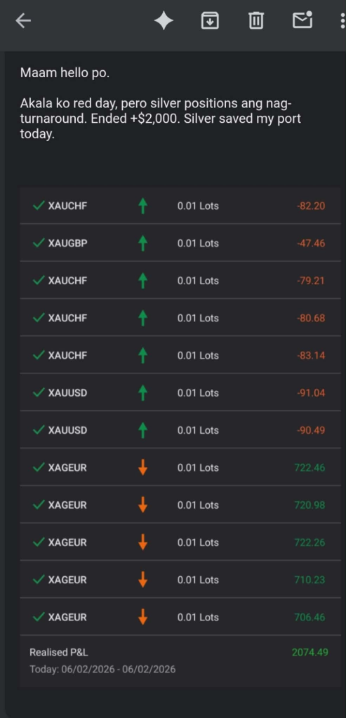 Marami siyang losses sa gold at may konting silver siya na trade pero yung silver trades niya pa na yun ang di lang nagpabreakeven sa kaniya but nagbigay pa ng profits.