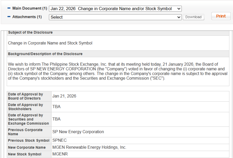 Naglabas ng disclosure ang SPNEC na magpapalit sila ng corporate name at stock symbol.