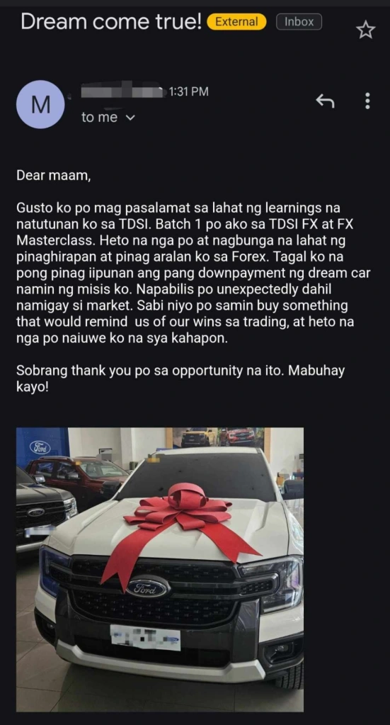 So far ay dalawang students pa lang namin ang nakabili ng sasakyan mula sa kanilang profits. This will not stop sa dalawa. I think more will earn and buy their dream cars as we keep producing great traders.