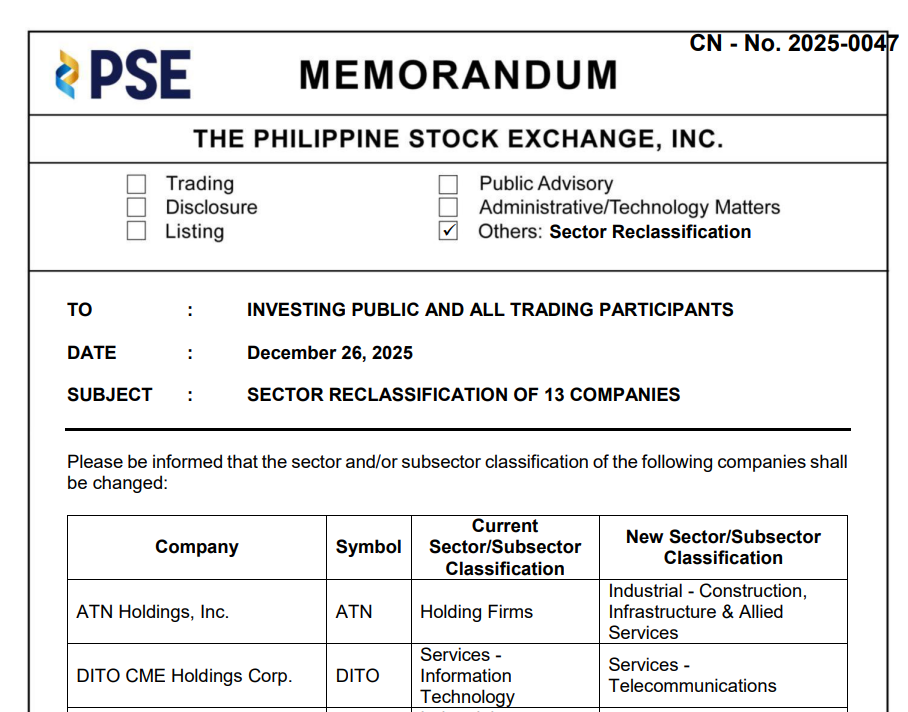 Naglabas ng memo ang PSE about some changes sa sector classification.